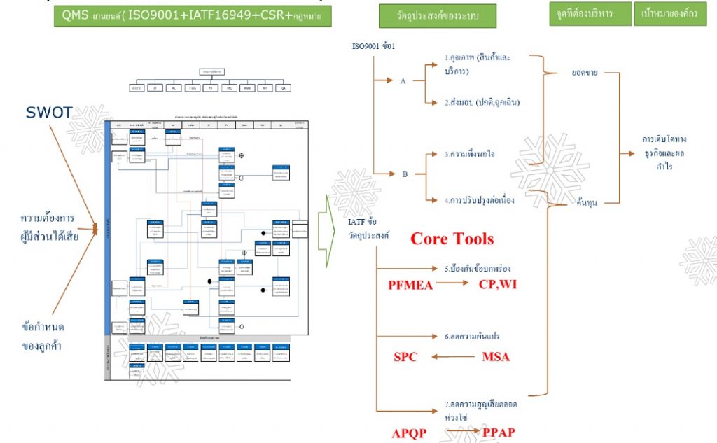 วัตถุประสงค์เป้าหมายของระบบ QMS ของอุตสาหกรรมยานยนต์มี 7 ประการ โดยมีการประยุกต์ใช้ Core Tools เพื่อทำให้ 3 วัตถุประสงค์เฉพาะสำเร็จ